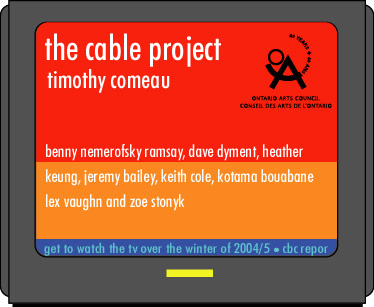 The Cable Project enabled media artists to expose themselves to a variety of televisual material with hope that it would benefit their practice. I gave away Rogers cable television subscriptions to eight Toronto media artists over the winter of 2004—2005.
