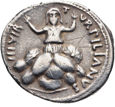 Denarius from 9982-83 HE (19-18 BCE) depicting Tarpeia crushed by the sheilds (Wikipedia)